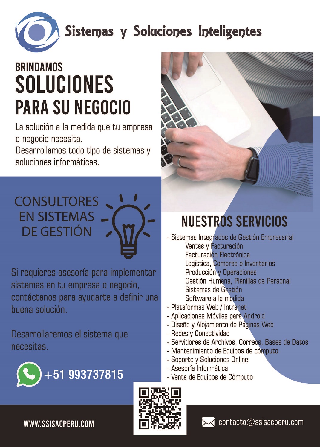 Sistemas y Soluciones Inteligentes SAC brinda asesoramiento tanto en el ámbito organizacional y administrativo de su empresa para el desarrollo de aplicaciones en plataformas web, entornos cliente / servidor, intranet, aplicaciones móviles, entre otros. Así como en consultoría y venta de equipos informáticos.